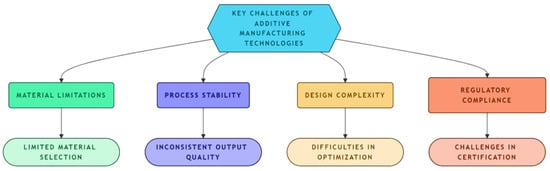In contrast to these advancements, several critical challenges need more focus in the future to increase the flexibility of this process. High capital costs associated with AM equipment, certainly with respect to a larger scale or using new materials, can deter small and medium-sized enterprises (SMEs) from integrating AM technologies into their production lines. Additionally, the availability of these new printing materials and the slowness of several additive manufacturing technologies restrict widespread applications in various sectors [10]. Post-processing challenges also present obstacles, as most AM technologies require additional steps of post-processing after 3D modeling to achieve the desired quality, which add more time and cost to the overall manufacturing process [11]. Furthermore, ethical and intellectual property concerns need attention as the use of 3D printing technologies raises questions about ownership rights and the potential for misuse. The ability to make replicated products using these technologies is very easy when a 3D modeling software’s and scanners are available, which can lead to unauthorized reproductions and infringement on patents; this can be a great concern within industrial applications [12]. Researchers and industry stakeholders must navigate these complex issues to foster a responsible and sustainable environment for additive manufacturing.