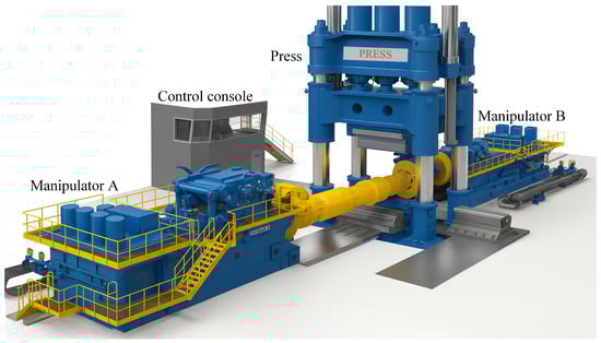 Forging manipulators are essential equipment in forging workshops, operating in coordination with hydraulic presses to clamp, position, and feed workpieces during forging processes. They play a critical role in the production of large-scale forgings and heavy-duty components [,,]. In current industrial practice, a single forging manipulator is commonly used in conjunction with a hydraulic press. However, this single-manipulator mode exhibits notable limitations when handling large and complex forgings, including low production efficiency, high energy consumption, unstable clamping, and inconsistent forming quality [,].