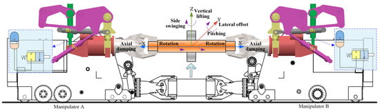 The motions of the suspension system and the trolley travel are transmitted to the workpiece via the gripper, enabling six degrees of freedom (DOF) manipulation in space, as illustrated in Figure 2. Specifically, the system allows for side swinging, vertical lifting, pitching, lateral offset, rotation, and axial damping actions. These degrees of freedom ensure that the manipulators can accommodate complex forging trajectories and dynamic deformation behaviors during the forming process. The rotational motion of the gripper is actuated by the hydraulic motor; the vertical lifting motion is provided by the lifting hydraulic cylinder; the pitching motion is controlled by the pitching hydraulic cylinder; the lateral offset motion is achieved by two independent hydraulic cylinders; the side-swinging motion of the gripper is driven by the rear hydraulic cylinder; and the forward and backward translational motion along the main beam is powered by the hydraulic motor.