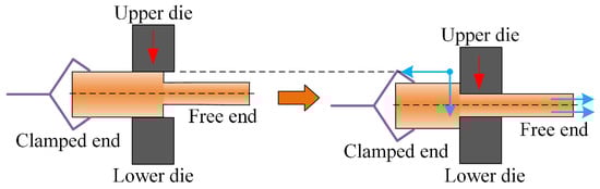 The compliant motion behavior of a single forging manipulator during one forging stroke for long-shaft forgings is illustrated in Figure 3. As the upper die moves downward, the clamping end of the forging undergoes deformation in both the horizontal and vertical directions. Meanwhile, the free end is unconstrained in the horizontal direction and passively follows the vertical motion of the clamped end. Compared to the bilateral constraints applied by the dual-manipulator mode, the single-manipulator configuration imposes lower compliance requirements on the clamping system.