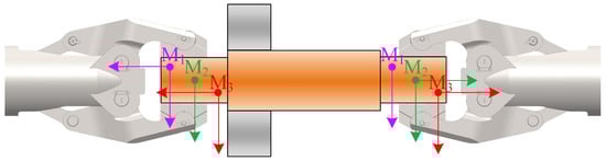 In the horizontal direction, the compliant motion of the grippers can be realized by a single manipulator or by both manipulators simultaneously. Using the midpoint of the forging length as a reference, the end closer to the die is defined as the near-die end (clamping end), and the opposite is the far-die end (free end). As illustrated in Figure 4, three potential compliant motion modes for the dual grippers are defined: Mode M1—compliance at the near-die end only; Mode M2—compliance at the far-die end only; and Mode M3—simultaneous compliance at both ends.
