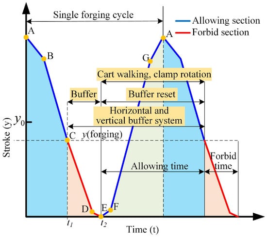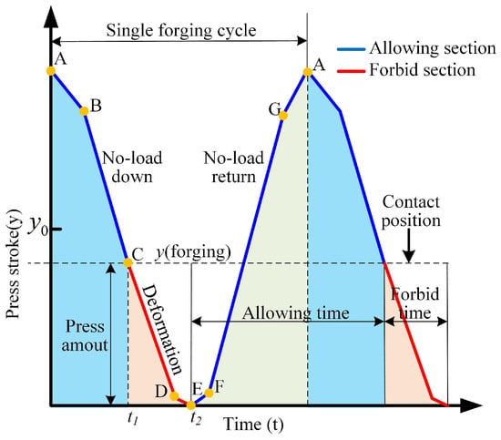 The motion cycle is divided into two segments: the allowable motion interval, during which the upper die is not in contact with the forging and manipulator motion is permitted; the forbidden motion interval, during which the upper die is in contact with the forging and manipulator motion is restricted. Based on this segmentation, a calculation method for determining the manipulator’s allowable motion time under high-speed forging conditions is established as follows: