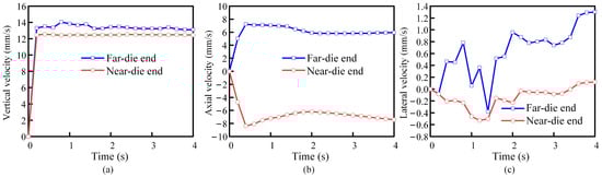 From Figure 7, it can be observed that: (1) In the vertical direction, the velocity at the far-die end is slightly higher than that at the near-die end and exhibits noticeable oscillations. The vertical deformation rate at both ends of the forging can be approximated as 50% of the press’s downward velocity. (2) In the horizontal direction, the far-die end velocity is slightly lower than the near-die end velocity. At the initial contact phase between the upper die and the forging, a sudden velocity change occurs, followed by gradual deceleration. Once stabilized, the horizontal deformation velocity reaches approximately 25% of the press stroke speed. (3) The lateral deformation velocity is also greater at the far-die end compared to the near-die end and shows more pronounced oscillations. The maximum lateral velocity at the far-die end is no more than 1.3 mm/s, which is approximately 3–5% of the press velocity, and thus can be considered negligible for practical operations.