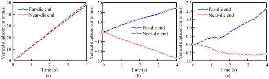 Taking the titanium alloy TC4 forging from simulation case No. 5 as an example, the press was configured to perform a constant downward stroke at a speed of 25 mm/s, with a total stroke of 100 mm. Both grippers on the manipulator sides were set to the free condition. The vertical deformation velocity curves of both ends are shown in Figure 7, while the displacement curves are presented in Figure 8.