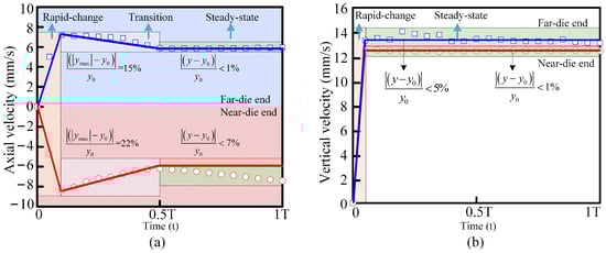 Based on this observed velocity behavior, and combined with the maximum axial deformation velocities and steady-state characteristics obtained from the six representative material simulations in Table 4, simplified axial velocity profiles over time can be generated for each material. These profiles capture the variation in axial deformation velocity at both the near- and far-die ends and reflect their relationship with press parameters.