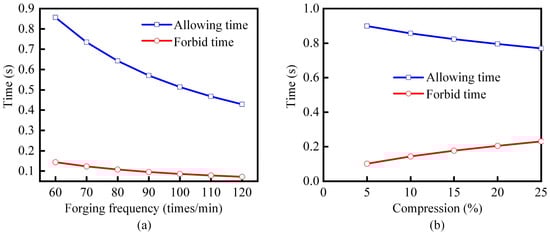 As shown in Figure 10a, for forging frequencies ranging from 60 to 120 strokes per minute, both the allowable motion time and the forbidden motion time decrease with increasing frequency. However, the allowable motion time exhibits higher sensitivity to changes in frequency compared to the forbidden time. When the press stroke per forging cycle increases from 5% to 25%, its influence on the manipulator motion time is illustrated in Figure 10b. The total manipulator motion time tends to decrease with increasing press displacement. Specifically, the allowable motion time decreases, while the forbidden time increases. Compared to forging frequency, the stroke depth has a relatively smaller impact on the allowable motion window of the manipulator.