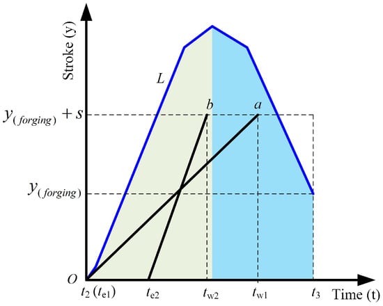 To enhance forging efficiency and reduce the complexity of the manipulator hydraulic system, the gripper ascent, rotation, and trolley movement must be performed simultaneously, provided that they do not interfere with the upper and lower dies of the press. As illustrated in Figure 11, the positional relationship between the press upper die displacement curve and two different gripper ascent curves is shown. In the figure, curve L represents the vertical motion of the upper die, while curves a and b denote two non-interfering gripper ascent trajectories. t2 is the end time of the first forging deformation; t3 is the start time of the second forging deformation; tei (i = 1, 2) is the initiation time of each gripper ascent curve; and twi (i = 1, 2) is the corresponding initiation time of trolley movement for each ascent motion profile.