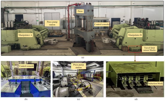 Experimental Setup of Dual-Manipulator System: (a) Dual Forging Manipulators and Hydraulic Press; (b) Central Control Console; (c) Hydraulic Press Pump Station; (d) Trolley Travel Limit Device of Manipulator.