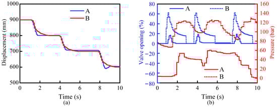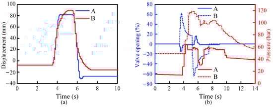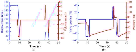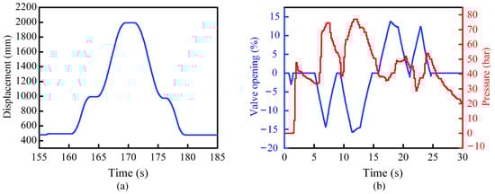 Experimental Curves of Lifting Motion of Manipulator A’s Suspension System (a) Lifting Cylinder Displacement; (b) Valve Opening of the Lifting Cylinder.