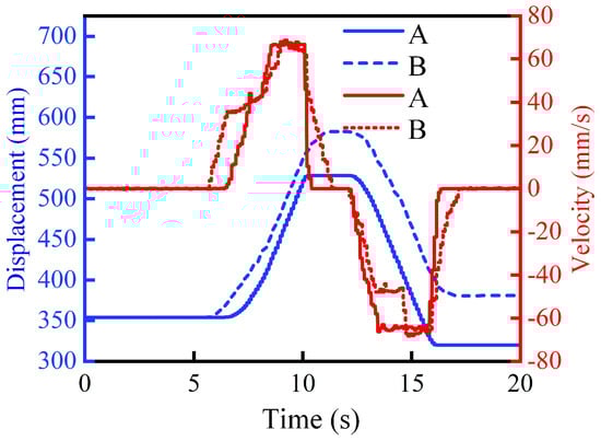 To verify dual-manipulator synchronized vertical motion, a manual control test was conducted with the system pressure set to 20 MPa. The velocity and displacement curves of the dual suspension systems during the synchronized lifting operation are shown in Figure 18. The results indicate that manual control leads to significant motion deviation, with a position error of approximately 50 mm between the two manipulators. Such error is insufficient for precise synchronization. Additionally, the lifting speed of Manipulator B shows a step-like profile, which could negatively impact the quality of the hot, flexible forging due to uneven support.