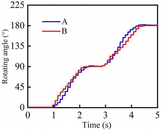 A further test was conducted to evaluate the synchronized rotational performance of the dual grippers. The maximum control signal for the proportional valve of the gripper rotation motor was set to 50%. As shown in Figure 19, the rotational synchronization between the two grippers was well maintained. During the rotation process, the maximum angular deviation between the two grippers was less than 5°, and the final angular error after the motion was completed was less than 1°. The rotation response time was approximately 1.2 s. Increasing the proportional valve control signal is expected to further improve the rotation speed, enabling the system to meet the requirements for synchronous gripping and rotation of the forging.