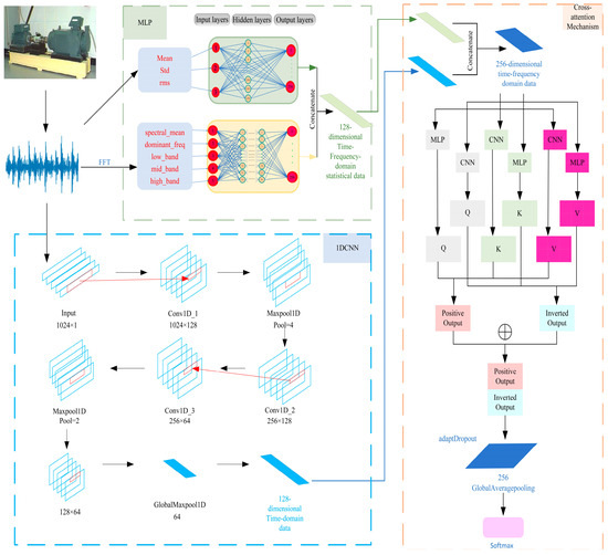 The proposed model architecture for the 1DCNN-MLP parallel dual-stream multi-scale feature fusion mechanism consists of a parallel 1DCNN, dual multi-layer perceptrons (MLPs), and serial cross-attention mechanisms. Initially, the timing data collected by the sensors are subjected to FFT. Thereafter, the timing data and the frequency-domain data after FFT are fed into the dual MLPs. Subsequently, the original timing data are fed into the 1DCNN for feature extraction. Then, the statistical features extracted by the dual MLP are aligned with the time-domain features extracted by 1DCNN and then sent to the cross-attention mechanism for deep feature fusion. Finally, forward and backward cross-attention are combined to enable fault diagnosis. The structure of the 1DCNN-MLP-Cross-Attention mechanism is illustrated in Figure 1 below.