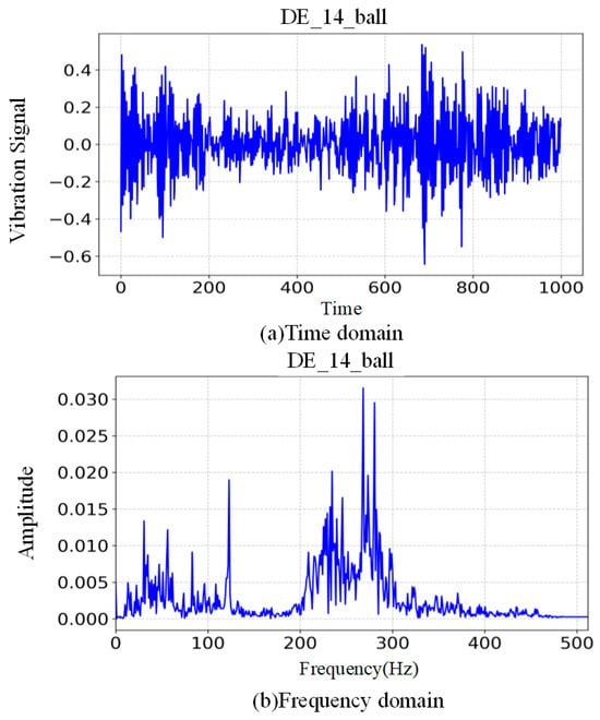 Initially, the three most significant statistics are extracted from the original time-domain data. The mean value reflects the average energy level of the signal, the standard deviation reflects the intensity of the fluctuation of the signal, and the root-mean-square (RMS) value reflects that the effective energy of the signal is directly related to the vibration energy. It is evident that these three statistics have the capacity to reflect the time-domain characteristics of the signal from a global point of view. The three time-domain features are entered into the time-domain multi-layer perceptron (MLP), while the fast Fourier transform (FFT) is used to convert the time-domain signal into a frequency-domain signal. This process enables the extraction of the mean value of the spectral components and the position of the dominant frequency, as well as the superposition of the high–middle- and low-frequency energies. Subsequently, the five frequency-domain features are entered into the frequency-domain MLP, as illustrated in Figure 2. The time-domain plot is represented by Figure 2a, whilst the frequency-domain plot is represented by Figure 2b. Time-domain and frequency-domain diagrams are illustrated using a 12 k 0.014-inch rolling ball fault as an example.