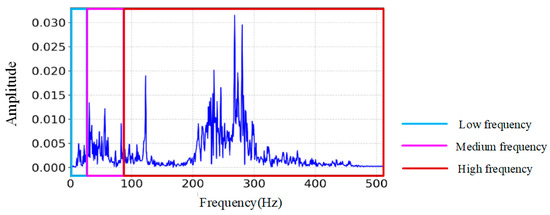 As demonstrated in Figure 3, the energy exhibited during the fault is predominantly concentrated within the high-frequency range of 100–512 Hz. It has been demonstrated that low-frequency energy (0–10 Hz) and mid-frequency energy (10–100 Hz) are significantly diminished in comparison to high-frequency energy.