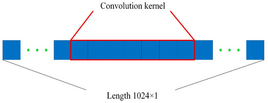 As the original vibration signal obtained from the bearing failure is one-dimensional time-series data, continuous downsampling enables 1DCNN to extract the time-series features from the points. The first layer of 1DCNN is Conv1D_1, with 128 filters and a convolution kernel size of 7. This sliding convolution uses a window of 7 time points, as illustrated in Figure 4 below.