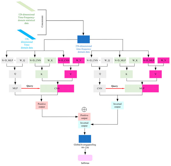 Unlike the ordinary attention mechanism, which can only carry out unidirectional transmission of feature information, the bidirectional cross-attention mechanism breaks the unidirectionality of the ordinary attention mechanism through bidirectional information interaction. Through this mechanism, the MLP and the 1DCNN can pay attention to each other’s features, enhancing the depth of feature extraction in the time–frequency domain.