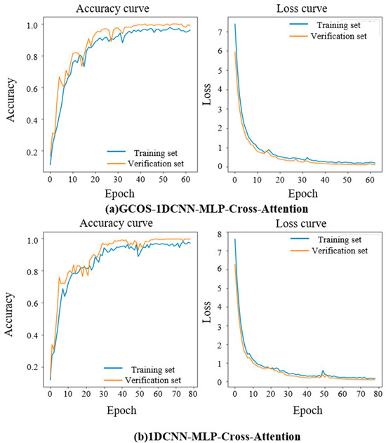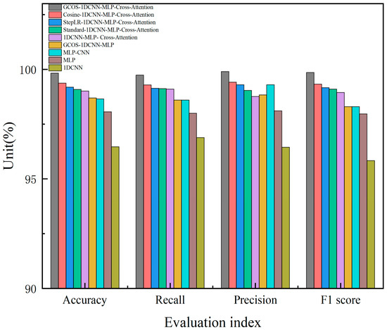 To make a more comprehensive comparison between each model, an ablation experiment is conducted for this model to compare the four evaluation indexes: accuracy, recall, precision, and F1 score. Fifteen independent experiments were conducted for each model, and the average result was calculated. Table 4 below shows the accuracy rates and standard deviations for the first five of fifteen experiments. The results of the ablation experiments for all indexes of the proposed model in this paper are shown in Figure 8. The detailed results are shown in Table 5. According to these results, it can be seen that the four indicators of the GCOS-1DCNN-MLP-Cross-Attention mechanism are optimal and that the accuracy rate has improved by 1.18% relative to the traditional 1DCNN-MLP fusion model, 1.764% relative to the traditional MLP, and 3.36% relative to 1DCNN. Comparing the accuracy rate of the 1DCNN-MLP-Cross-Attention mechanism model with that of the traditional 1DCNN-MLP model, it can be seen that the average accuracy of the model improves by 0.36%, rising from 98.65% to 99.01%. This indicates that the cross-attention mechanism module proposed in this paper improves the classification accuracy of the model. Based on the fair ablation results, replacing GCOS with cosine, StepLR, or the standard scheduler reduced the model accuracy by 0.46%, 0.64%, and 0.742%, respectively. These results demonstrate that the GCOS learning rate scheduler outperforms cosine, StepLR, and the standard scheduler. Observing Table 4 shows that the standard deviation of the model proposed in this paper is only 0.236 over five trials, indicating that the model achieves the highest accuracy while also showing high robustness. It is noteworthy that following the incorporation of the CNN-MLP with the learning rate scheduler proposed in this study, the accuracy rate is enhanced to 98.7%. The findings reveal that the golden learning rate scheduler proposed in this paper plays a significant role in enhancing the model’s accuracy. Further investigation into the impact of the golden cosine learning rate scheduler on the model was conducted. To this end, a comparison is made between the model proposed in this paper and the 1DCNN-MLP-Cross-Attention mechanism model, with and without the golden cosine learning rate scheduler. The accuracy and loss curves of the 1DCNN-MLP-Cross-Attention mechanism model with and without the golden cosine learning rate scheduler are shown in Figure 9 below. It is evident from this figure that the accuracy of the GCOS-1DCNN-MLP-Cross-Attention mechanism fluctuates considerably from the 15th to the 35th round of training and then gradually converges to 1 and finally converges in the 60th round. The loss curves of the model also fluctuate in the 60th round. The loss curve of the model also reaches convergence at approximately round 60. In contrast, the accuracy of the 1DCNN-MLP-Cross-Attention mechanism model without the addition of the golden cosine learning rate scheduler fluctuates considerably between rounds 25 and 50 and finally converges at round 80. As demonstrated in Figure 10, the learning rate undergoes a change following the implementation of the learning rate scheduler. In this paper, the initial learning rate is set to 10−3, and the golden cosine learning rate scheduler establishes a minimum threshold for the learning rate, equivalent to 1% of the initial learning rate (illustrated as the red line in Figure 10). The golden learning rate scheduler causes the learning rate to vary in a cosine function-like manner, and in the process of automatically adjusting the learning rate, the model uses a dynamic learning rate that perfectly balances the disadvantages of overfitting and slow convergence.