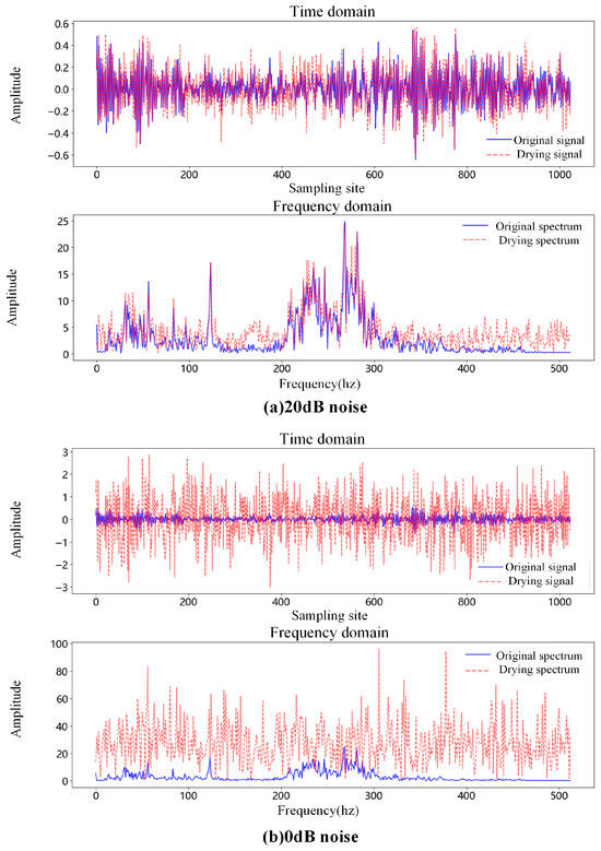 As illustrated in Figure 11 below, the fault signal of a 0.014-inch rolling ball fault at the 12 k drive end, with 20 dB and 0 dB Gaussian noise added, is shown. When the signal-to-noise ratio is 20 dB, the noise has little effect on the signal, and it is not difficult to extract the original vibration signal. When the signal-to-noise ratio is 0 dB, it indicates that the energy of the noise signal is the same as that of the original vibration signal, and it can be seen in the figure that the original vibration signal in blue has been completely destroyed when the signal-to-noise ratio is less than 0 dB, which indicates that the intensity of the noise signal has already exceeded the original vibration signal strength. At this time, it becomes extremely difficult to extract the original signal characteristics from the strong noise.