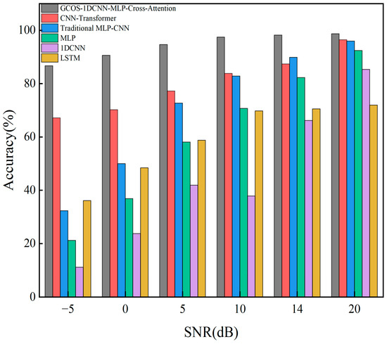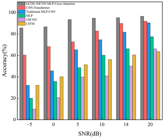 Figure 14 shows the experimental results, with the detailed outcomes presented in Table 9. The results indicate that, under variable load conditions, the performance of all models declined compared to single-load scenarios. However, the GCOS-1DCNN-MLP- Cross-Attention model demonstrated particularly robust performance, ranking first among the six models across various SNRs and maintaining an accuracy of 93.47% even in the presence of 5 dB of noise. At this point, the accuracy of the other models dropped below 80%. Under high noise conditions of −5 dB, the GCOS-1DCNN-MLP-Cross-Attention model achieved 25.3% higher accuracy than the CNN-Transformer model, while the other models nearly lost their classification capability. Figure 15 shows the confusion matrix for the GCOS-1DCNN-MLP-Cross-Attention model under variable loads ranging from 0 HP to 1 HP and 0 dB noise. These results demonstrate that the GCOS-1DCNN-MLP-Cross-Attention model exhibits robust performance under variable loads and noisy conditions.