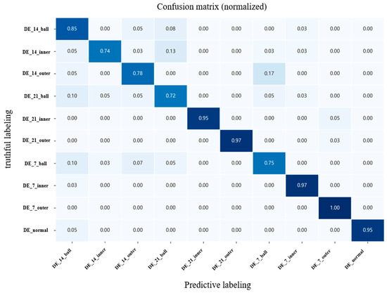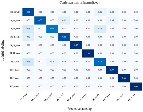 To demonstrate the robustness of the proposed model and its performance under variable load noise conditions, data from the 12 K drive under 0 HP load conditions were used as the training set. Data from the 12 K drive end operating at a 1 HP load were used for both the test and validation sets (1 HP = 0.7457 kW). The noise addition method remained consistent with that used in the preceding section. Detailed data are presented in Table 8.