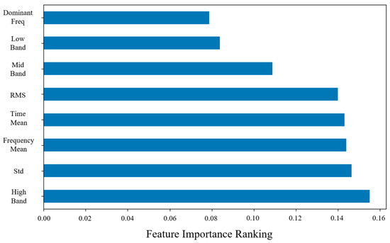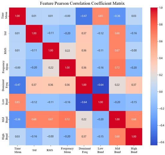 To validate the rationale behind the feature selection in this paper, which includes three time-domain features and five frequency-domain features, a feature correlation analysis was conducted. Figure 16 below shows the importance ranking, while Figure 17 depicts the Pearson correlation coefficient matrix for the eight features. Figure 16 shows that high-frequency energy is the most critical feature, demonstrating that energy distribution in the high-frequency band significantly impacts model performance. Feature importance values exceeding 0.14 were observed for time-domain standard deviation, frequency-domain mean, time-domain mean, and RMS, indicating that statistical characteristics in both time and frequency domains significantly influence model performance. Mid-frequency and low-frequency energy are ranked sixth and seventh in terms of importance, respectively, while the dominant frequency position is ranked as the least important. This suggests that the singular peak frequency location in the data provides weak discriminative power for classification or prediction. Determining feature correlation and redundancy requires an examination of the absolute values of the Pearson correlation coefficients between features. As Figure 17 shows, all the correlation coefficients in the current matrix have absolute values below 0.7, with the highest being 0.68. Therefore, there are no strong correlations among the eight features. Specifically, no correlation exists between the dominant frequency position and the other features. The correlation between low-frequency energy and the time-domain mean is 0.65, while the correlations between mid-frequency energy and the time-domain standard deviation, root mean square (RMS), and the frequency-domain mean are 0.68, 0.67, and 0.72. Feature subset ablation experiments were conducted. These defined the removal of mid-band energy, low-band energy, and the simultaneous removal of mid- and low-band energy as ablation groups 1, 2, and 3, respectively. The results of these experiments are shown in Table 10. Removing mid-band energy alone resulted in a 1.51% decrease in the model’s average accuracy. Removing low-band energy alone resulted in an average accuracy decrease of 1.73%, while simultaneously removing mid- and low-band energy resulted in an average accuracy decrease of 2.6%. This indicates that mid–low-band energy significantly enhances the model’s performance. To investigate the effect of mid–low-frequency energy on model performance in more detail, the feature distributions of mid-band and low-band energy were compared. The feature distribution comparison diagram clearly illustrates the differences in the distribution of mid-band and low-band energy across different categories. Figure 18 shows the feature distribution comparison diagram for mid-band and low-band energy.