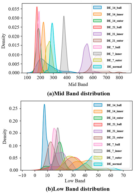 Figure 18 shows that the mid-frequency energy distribution exhibits a multi-peak characteristic. The DE_14_ball category has the highest mid-frequency energy peak, forming a distinct single peak between 300 and 400 Hz, which differs from the peaks observed in the other categories. Meanwhile, DE_21_ball and DE_7_ball exhibit a bimodal distribution between 200 and 400, and the low-frequency energy distribution shows distinct zones of energy concentration. DE_14_outer demonstrates an extremely high peak in low-frequency energy, forming a single peak near zero. This indicates that its signal components are predominantly of a low frequency. This suggests that, although mid-frequency and low-frequency signals are somewhat correlated with other features, they significantly contribute to specific faults. Thus, joint analysis confirms that the eight selected features demonstrate excellent performance in terms of both data distribution and model contribution, making their selection both reasonable and necessary.