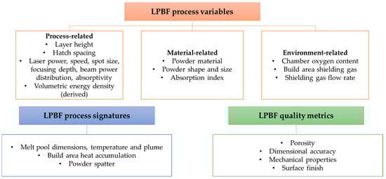 Figure 2 presents an overview of the main LPBF process parameters and process signatures, along with quality metrics [26] of the final part, which are used to define process performance.
