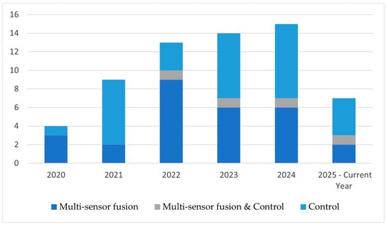 The research procedure mentioned above resulted in a final list of 62 relevant publications from 2020 to 2025, of which 28 address multi-sensor monitoring of LPBF process, 30 study process control, while 4 examine both topics. Figure 3 presents an overview graph of the listed publications from 2020 to 2025.