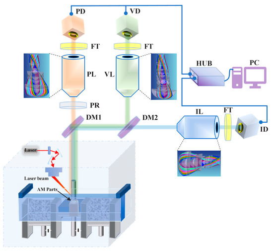 Building on the premise that single-channel data is rarely sufficient, Peng et al. [30,31] published two articles concerning the design and development of a multi sensor defect monitoring system shown in Figure 4. The system uses a fusion of visible light, IR, and a polarization imaging channel in a co-axial configuration, designed and optimized via Monte Carlo analysis, which proves capable of high quality, in situ defect image extraction. The authors reasoned that single sensor monitoring provides insufficient levels of information in order to accurately monitor the LPBF process.