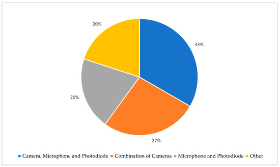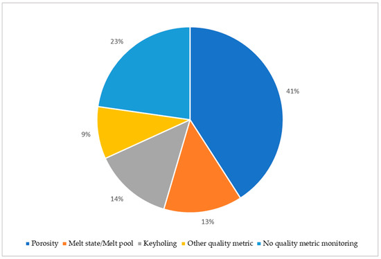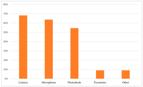 From the data presented in Figure 6, Figure 7 and Figure 8 the trends of sensor fusion are visible, notably in sensor type and monitored characteristics of the process. In Figure 6, the occurrence of sensors or sensor combinations in the surveyed literature is presented. In this figure, the percentages of each column are derived from the amount of literature where the sensor type attributed to the column is used alongside others in a multi-sensor monitoring method. For example, the usage of any type of camera in almost 70% of the methods proposed in the literature makes it apparent that camera-based data streams (visible, IR, HS, etc.) are the go-to modality and are often used as part of a sensor fusion scheme. Microphones and photodiodes are also popular, achieving only slightly lower usage metrics than cameras. Conversely, pyrometers are scarcely found in the literature, along with signals included in the “other” category, consisting of machine outputs and laser galvanometer position signals. This trend suggests a convergence on vision plus acoustics/optics as the default sensor stack. When it comes to the monitored characteristic, Figure 7 shows porosity prediction is still the most frequently reported approach, followed by keyhole detection and melt pool/state monitoring. It is worth noting that a large portion of the literature does not opt to obtain data directly related to the quality of the part or possible defects, instead capturing data such as deviation from the selected process parameters, or the energy input state of the process. In Figure 8, the usage rates of exact setups for monitoring porosity, melt pool/melt state and keyholing are shown. The setups consisting of a microphone, photodiode, and camera are the most common, with the same setup but with the omission of the camera also following closely. The usage of different types of cameras together is also notable, since it signifies the importance of camera positioning as well as its type when it comes to collecting varied data. Concerning the fusion methods, CNN pipelines are still the most frequently reported approach. However, the appearance of GAN, CLIP, and CNN + LSTM hybrids in the last three years signals a shift toward richer temporal or generative representations as datasets grow.
