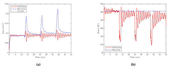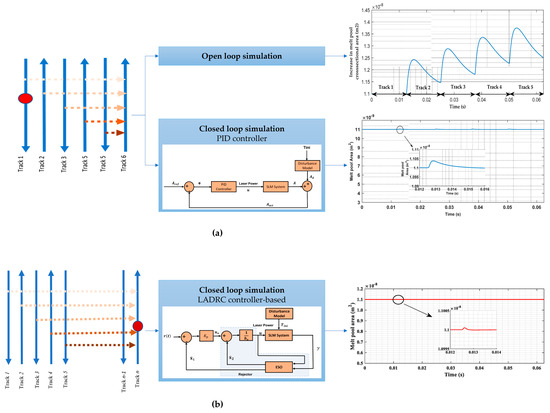 Wang et al. [53] developed a closed-loop control system to adjust laser power based on captured melt pool emissions. A light-dependent resistor (LDR) was utilized on a customized LPBF platform to monitor powder bed thermal emissions, and two Arduino microcontrollers were employed to run the developed PID control and data acquisition programs. Experimental printings implementing the feedback control were performed on a customized smart LPBF testbed that exhibits high printing quality, enabling in situ sensing and control. Microscopic imaging and high spatial resolution 3D scanning of the printed parts indicated that both the average and the standard deviation of the dimensional error improved when adaptive laser-power control was applied, compared to the constant power cases. The authors also highlight the low-cost and computer-independent operation of the proposed controller. Similarly, Hussain et al. [54] designed a PID feedback control strategy based on thermal model of the melt-pool area dynamics derived from energy balance and the effect of heat from adjacent scan tracks. They carried out both open-loop simulations to observe how disturbing heat from previous tracks affects melt-pool size, and closed-loop simulations to test the PID controller’s response across multiple tracks with different disturbance scenarios, Figure 9a. Simulation results demonstrate that the proposed PID controller effectively stabilized the melt pool cross section area by dynamically adjusting laser power across scan tracks, while the authors also suggest further validation either through in situ melt pool measurements or by comparing single-layer builds produced with and without melt pool area regulation via laser power adjustment.