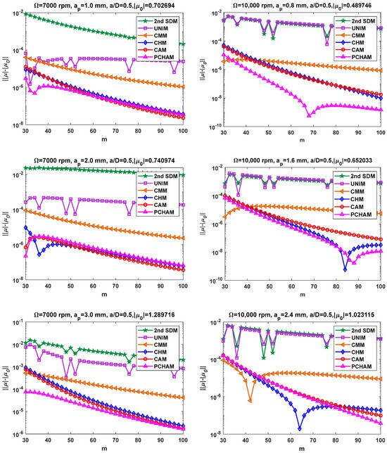 Figure 1 shows that the CHM, CAM and PCHAM converge to the exact spectral radius much more rapidly than the 2nd SDM, UNIM and CMM under conditions of medium radial immersion. For example, when m = 60 and = 2.0 mm, the LDEs acquired by the 2nd SDM, UNIM, CMM, CHM, CAM and PCHAM are 1.67 × , 3.31 × , 1.17 × , 4.88 × , 4.16 × and 6.57 × , respectively. In most cases, the PCHAM converges only slightly faster than the CHM and CAM, especially when the spindle speed is 10,000 rpm and the axial depth of the cut is 0.8 mm, and it is found that the convergence rate of the PCHAM is notably faster than that of the CHM and CAM. Moreover, the numerical stabilities of the three proposed methods are obviously superior to those of the 2nd SDM and UNIM for half radial immersion milling. Hence, the three proposed methods achieve faster convergence and better precision than the 2nd SDM, UNIM and CMM under conditions of medium radial immersion.