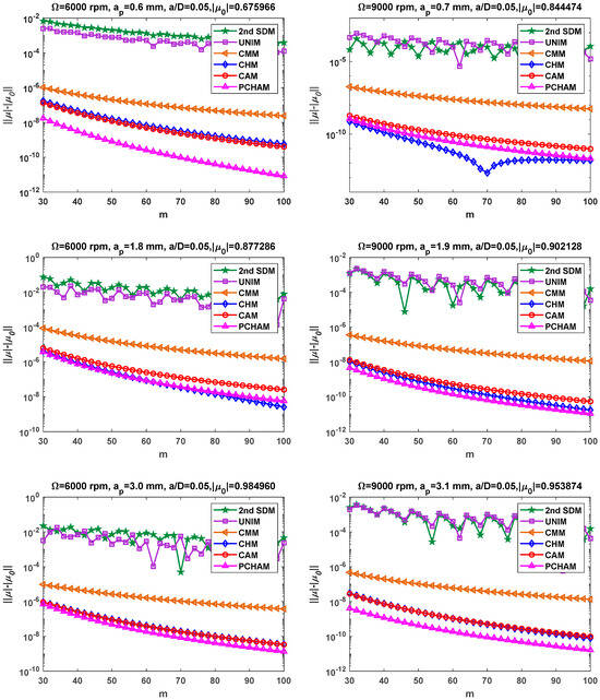 To further assess the convergence effect of the three proposed methods, two combinations of machining parameters are selected for algorithm verification, including two spindle speeds ( = 6000 and 9000 rpm), six axial cut depths = (0.6, 1.8, 3.0, 0.7, 1.9, and 3.1) mm and a small radial immersion ratio ( = 0.05). Figure 2 illustrates the convergence rates of the 2nd SDM, UNIM, CMM, CHM, CAM and PCHAM with low radial immersion milling. The exact spectral radius is still determined based on a CHM with m = 1000. Figure 2 shows that the convergence rates of the three error correction methods are significantly better than those of the 2nd SDM, UNIM and CMM. For example, when m = 60 and = 3.1 mm, the LDEs acquired by the 2nd SDM, UNIM, CMM, CHM, CAM and PCHAM are 2.22 × , 3.99 × , 6.09 × , 1.04 × , 1.08 × and 1.86 × , respectively. At the same time, the convergence rate of the PCHAM is slightly higher than that of the CHM and CAM, especially when the spindle speed is 6000 rpm and the axial depth of the cut is 0.6 mm; it is found that the convergence rate of the PCHAM obviously outweighs that of the CHM and CAM. Moreover, the numerical stabilities of the three proposed methods are obviously superior to those of the 2nd SDM and UNIM. Overall, Figure 1 and Figure 2 validate that the three proposed methods achieve faster convergence and better precision than the 2nd SDM, UNIM and CMM under conditions of both medium and low radial immersion.