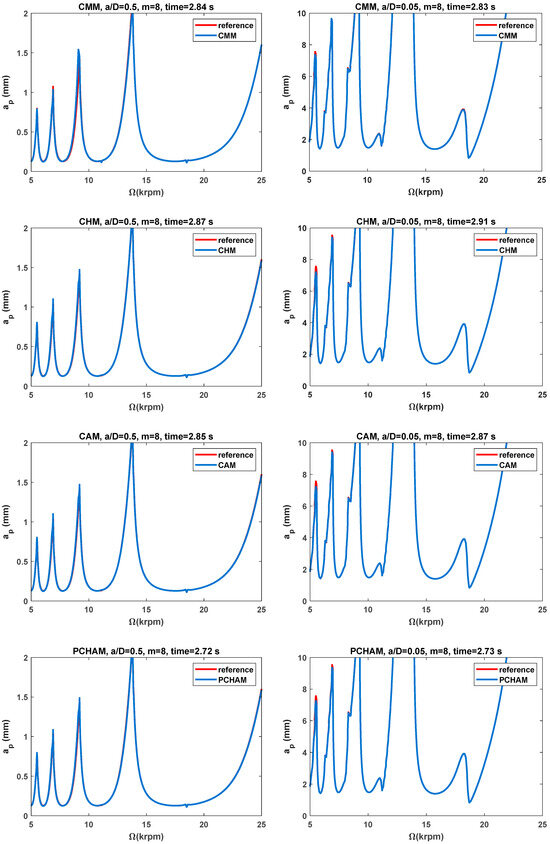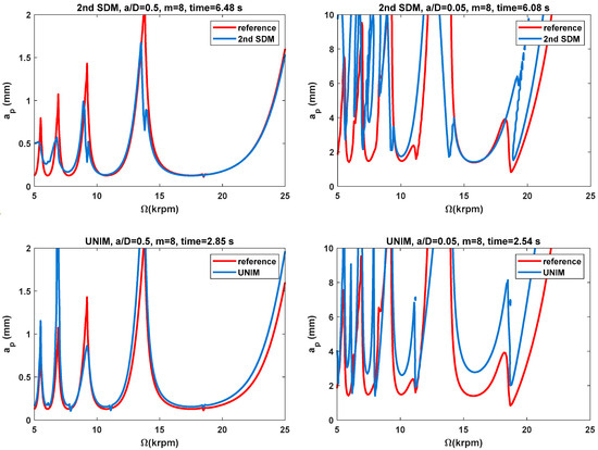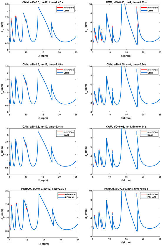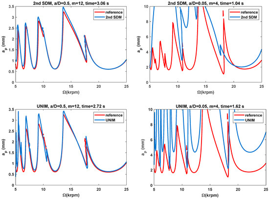 To further illustrate the effectiveness of the three proposed methods and examine the two radial immersion conditions, the modal parameters of the two-DOF milling dynamics system and the three conventional methods are employed. Therefore, the 2nd SDM, UNIM, CMM, CHM, CAM and PCHAM are applied directly to construct SLDs over an equidistance grid with a size of . The SLDs of these six methods with a time interval m of 8 are presented in Figure 7, and the corresponding computation times are summarized in Figure 4. Based on the two-DOF milling model, two different radial immersion ratios, = 0.5 and 0.05, are selected to construct the SLDs. As shown in Figure 7, the reference stability lobes, denoted by the solid red line, are determined by the CHM with a relatively large time interval (m = 1000). Meanwhile, the predicted stability lobes denoted by the solid blue line, are calculated via the three existing methods and the three proposed methods under the same time interval m. Figure 7 indicates that with respect to the reference stability lobes, those predicted by the CHM, CAM and PCHAM reveal better agreement, those predicted by the CMM exhibit only small deviations, and those predicted by the 2nd SDM and UNIM reveal noticeable deviations; this means that the prediction accuracy of the SLDs computed by the three proposed methods are much better than that of the SLDs computed by the 2nd SDM, UNIM and CMM under conditions of small and medium radial immersion. In addition, Figure 4 shows that when the radial immersion ratio is 0.5 and discrete number m is 8, the 2nd SDM, UNIM, CMM, CHM, CAM and PCHAM require 6.48 s, 2.85 s, 2.84 s, 2.87 s, 2.85 s and 2.72 s, respectively, to generate SLDs. When compared with the 2nd SDM, the calculation time of the CHM, CAM and PCHAM can be reduced by around 56%, 56% and 58%, respectively. This demonstrates that the three proposed methods achieve faster computing speeds than the 2nd SDM under the same conditions. Simultaneously, the three error correction methods require approximately the same amount of calculation time as the UNIM and the CMM. Therefore, the three error correction methods can achieve better prediction accuracy than the 2nd SDM, UNIM and CMM without loss of computational efficiency.
