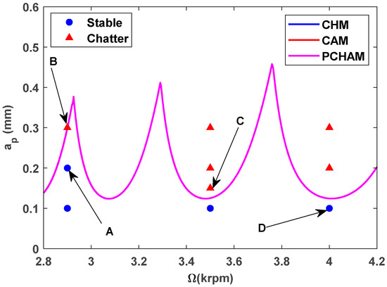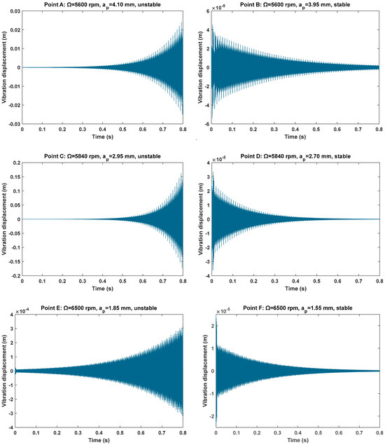 The relative tolerance and maximal solver step size are both set to , and the initial conditions of the DDE23 function are set to 25 and 0 m/s, to calculate the vibration displacement responses of six groups of parameter points, as depicted in Figure 6. In the low-speed region, it can be seen that parameter points A (5600 rpm, 4.10 mm), C (5840 rpm, 2.95 mm) and E (6500 rpm, 1.85 mm) are unstable, while points B (5600 rpm, 3.95 mm), D (5840 rpm, 2.70 mm) and F (6500 rpm, 1.55 mm) are stable. It is indicated that when the spindle speed is 5600 rpm, the stability curves are obtained at axial cut depths ranging from 3.95 mm to 4.10 mm; when the spindle speed is 5840 rpm, the stability curves are obtained at axial cut depths ranging from 2.70 mm to 2.95 mm; and when the spindle speed is 6500 rpm, the stability curves are obtained at axial cut depths ranging from 1.55 mm to 1.85 mm. In the 2nd SDM and UNIM, all of the predicted cutting states are completely incorrect. The cutting states of points A and C are always misjudged in the CMM, and the cutting state of point C is easily misjudged in the CHM and the CAM. However, the predicted results of the PCHAM are basically consistent with the cutting states. These results demonstrate that the accuracy of stability lobes computed by the PCHAM is much better than the stability of those computed by the 2nd SDM, UNIM, CMM, CHM and CAM under conditions of marginal stability.