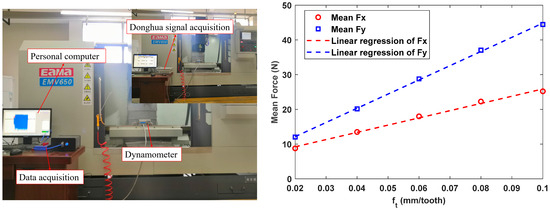 To evaluate the effectiveness and applicability of the three proposed error correction methods, a series of slot-milling experiments were conducted using a CNC machine (EMV650). In all of the cutting tests, a four-flute end-milling cutter with a 10 mm diameter and helix angle was mounted on the spindle. Simultaneously, the aluminum alloy AL6061 was chosen as the material for the workpiece. The apparatus for obtaining the modal parameters comprised a Donghua LC02 impact hammer, a Dytran 3224A1 acceleration sensor, and a Donghua DH5922 signal acquisition instrument, as shown in Figure 8. In the impact tests, the Donghua LC02 impact hammer was employed to hit the cutter tip of the tool in the x and y directions to create an exciting force, the Dytran 3224A1 acceleration sensor was used to collect the corresponding vibration signals, and the Donghua DH5922 signal acquisition instrument was employed for modal parameter identification. Subsequently, the cutting force coefficients were calibrated via five groups of full slots milling experiments. The average cutting forces in the x and y directions under a constant spindle speed and axial cut depth, and different speeds of feed per tooth, are displayed in Figure 8.