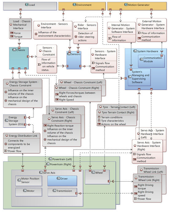Due to the sophistication of the CTWSBV, its design requires a structured procedure, which in turn, to be properly expressed, necessitates a clear overview of the system itself, inclusive of its different components and their reciprocal interactions; these in particular are relevant not only during the operation of the vehicle, but also at the design stage. This motivates the adoption of a modeling language typically used for this specific task within the more general MBSE approach. Within the scope of this paper, the adopted language is the one embedded in ARCADIA and implemented in the Capella 5.2 software. This choice allows the description of the self-balancing vehicle as a mechatronic system characterized by interconnected components, with the goal of providing an overview of the main design objects. Specifically, the developed representation, reported in Figure 1, is able to provide an outline of the main subjects of the design process while remaining general enough to accommodate several vehicle variants and different design solutions. With reference to the figure, three main kinds of block may be distinguished: components (blue), interfaces (pink), and actors (orange); the green blocks represent component groupings that do not display interfaces in their own right. The directionality of the interfaces is accounted for using the syntax of the adopted modeling language; in particular, as may be observed in the figure, the providing element of the connected pair is denoted using a ball, while the requiring counterpart is marked by a socket.