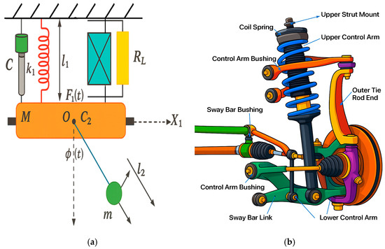 Figure 1a illustrates a hybrid system that incorporates a vibration absorber based on a pendulum. Figure 1b illustrates an automotive suspension system, which describes the main function of an automobile’s suspension system as maintaining stability by counteracting outside forces. The forces that potholes, bumps, and other road impediments apply to the car’s body are referred to as external forces in this context. The suspension also provides better handling by keeping the vehicle steady at high speeds and in curves, which is one of the most important applications of the system, as shown in Figure 1a.