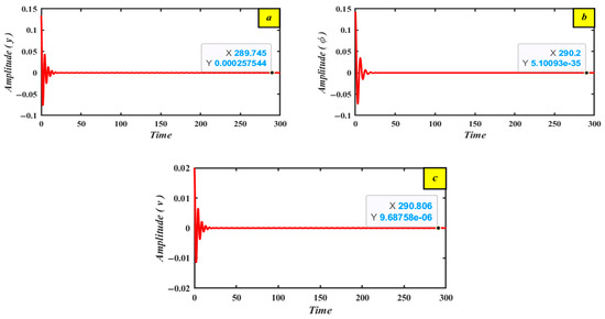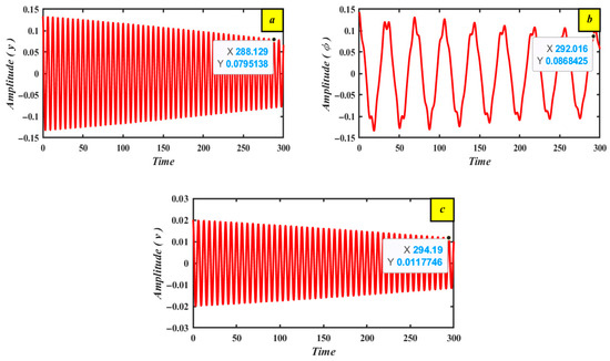 This subsection describes the nonlinear dynamical framework that appeared in Figure 3 to describe Equations (1)–(3), which uses PH control. The MATLAB® R2023b computer program is then used to numerically simulate the associated PHPD control to select the optimal control, as seen in Figure 4. When the PHPD controllers are used, the vibration amplitudes for the primary system become 0.00025744 (), 5.10093 × 10−35 () as shown in Figure 4. This indicates that the vibrations are suppressed to about 99.67% () and 100% () of their value, with a time range of for and for . Hence, the components that are used for the modeling process are , , , , and at the initial conditions: