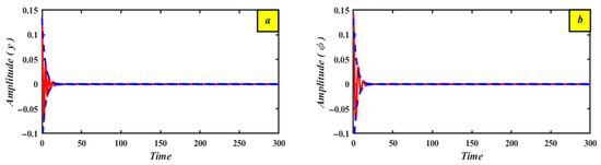 By displaying their individual time histories, Figure 5 contrasts the perturbation techniques of Equations (42)–(47) with the computational simulation of Equations (5)–(7). The generalized coordinate’s amplitude modulation, as determined by the MSPT, is shown by the blue crossed lines. On the other hand, the mechanical system’s time history of oscillations as computed using the RK-4 technique with the PHPD controller is indicated by the red straight lines. The suggested method is validated by the strong agreement between the theoretical and computational results.