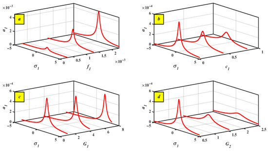 The generated FRCs, which are shown in Figure 6 and Figure 7, provide a full description of the actions of the different coefficients of the controlled scheme that uses PHPD. Figure 6a–d show the collaboration between multiple parameters via the detuning parameter and the main system , while Figure 7a–e depict the behavior of the parameters with the detuning parameter and the system . Figure 6 and Figure 7 have just one peak with a stable region. After understanding the prior FRC, the amplitudes of the primary system () increase as increases, as seen in Figure 6a. Figure 6b illustrates how affects FRC. As the value of increases, the corresponding system curve falls. Figure 6c,d show the actions of and through and the primary system . Both and have a high amplitude for , with tiny values for both and , and subsequently, the amplitude decreases, with large values for both. Additionally, a dramatic drop in the amplitude of was noted for large values of .