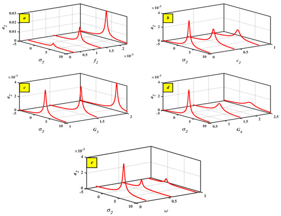We will now illustrate the effect of changing the value of the parameters via the detuning parameter and the system , as shown in Figure 7. The second system amplitude against is shown in Figure 7a. There is a single peak around . The FRC demonstrates that the amplitude of increases as f increases. It depicts the decreasing amplitude curves for Figure 7b,d,e. These outcomes were achieved by raising the values of , , and . The consequence of on the FRC is demonstrated in Figure 7c, revealing that the beak relocated to the right and the amplitude of rose as the quantity of increased.