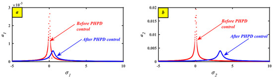 The performance of the uncontrolled systems and in the FRC before and after introducing PHPD are shown in Figure 8. The best option for lowering the vibration amplitude is the PHPD controller, while the detuning parameters and fall within the ranges of and , respectively.