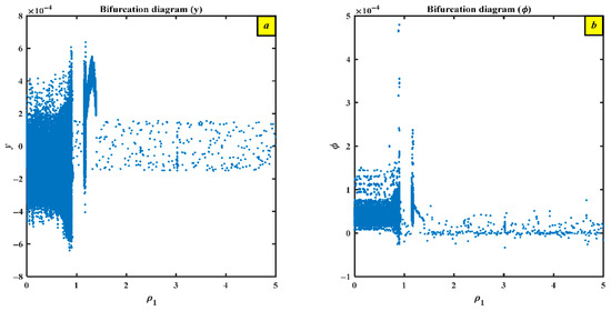 Bifurcation diagrams of (a) vs. (b) vs. .