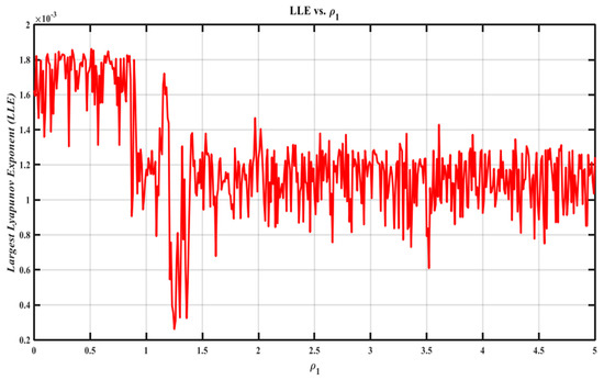 To comprehend the intricacy of nonlinear dynamical phenomena, it is essential to examine chaotic actions in this section. When the framework’s characteristics are altered, as they are in our situation, the system undergoes a change that can result in a variety of behaviors, ranging from complete chaos to stable periodic motions. The bifurcation schematic, which illustrates how the system reforms as a critical parameter changes, successfully captures this shift. An analysis of the Lyapunov Exponent is additionally available. The dynamic behavior of a nonlinear system regarding a variable control or mechanism parameter, represented by in Figure 9, is depicted by two bifurcation diagrams, labeled as (a) and (b). We will now present the findings of the first section, which examines the relationship between and . The framework displays a chaotic state for small amounts of (), as indicated by the dense and scattered spots in the bifurcation diagram of against what Figure 9a depicts. The system then experiences bifurcations as rises above , ultimately moving toward periodic or quasi-periodic behavior (more organized and distinct points). The system seems to stabilize at the last area, exhibiting more regular oscillations or steady-state behavior, with larger amounts of (). The behavior bifurcation diagram is shown in Figure 9b ( via ). For low levels, chaotic dynamics are seen, much like in diagram (a). As increases (), bifurcations and a shift to periodicity are suggested by the scatter becoming less dense and more ordered. The LLE is displayed in the illustration of Figure 10 as a function of . For , the chaotic regime is confirmed by the extreme LLE, which also matches the bifurcation charts showing scattered points. Then, for (), the mechanism moves via bifurcations toward more regular behavior when LLE drastically drops and varies, indicating that chaos is being repressed. At the last region (), LLE steadies with minor fluctuations around its smallest value, which implies that the more structured periodic activity in the bifurcation diagrams is consistent with reduced chaos or weakly chaotic behavior. Two-phase portraits in Figure 11 depict the state-space trajectories of a nonlinear dynamical system at a particular parameter value, . The previously displayed bifurcation diagrams and Lyapunov exponent support the idea that this value belongs to a regime in which the system behaves in a chaotic manner. At , we can concentrate on some points. In either state-space projection, the entire system behaves chaotically, and the framework is in a classical weird attractor condition where its paths never repeat but are nonetheless bounded. A coherent picture of chaos is presented by these graphs in conjunction with the earlier bifurcation and Lyapunov exponent diagrams. Lastly, the chaotic nature is confirmed by the absence of periodicity or transitions to order, which may be detected using the red Poincaré sections.