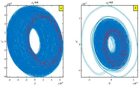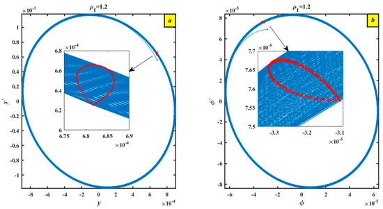 A nonlinear dynamical mechanism’s phase portraits (blue) and Poincaré maps (red) with the value of the parameter (a) vs. (b) vs. .