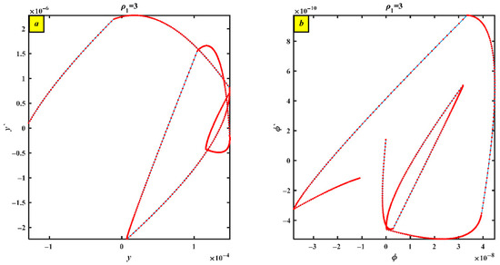 Two-phase pictures (subplots a and b) of a nonlinear dynamical system with a parameter estimate are displayed in Figure 11. Both visualizations show intricate and possibly chaotic dynamics with dispersed points and dense trajectories, suggesting a substantial change in the behavior of the system in comparison to earlier instances. Plotting and while examining the route creates a toroidal or donut-like shape, as shown in Figure 11a. A quasi-periodic or chaotic attractor with dense non-repeating motion is represented by the blue lines. The central hole implies that the track continuously circles the center rather than ever crossing it. Because of their irregular dispersion, the red spots are probably Poincaré section points or markers that demonstrate discontinuous sampling of the trajectory, verifying chaotic or quasi-periodic activity. Figure 11b, which plots and , has a different scale and form but displays a toroidal structure that is comparable to that in Figure 11a. Uneven spacing and inner loops point to chaotic evolution. Additionally, the red pixels are dispersed erratically, which lends credence to the idea of chaotic dynamics. Two subplots (designated as a and b) in Figure 12 display phase portraits of a nonlinear structure for a given parameter measurement, . Zoomed-in insects that display significant centralized variations in behavior are included in both charts, which also demonstrate the way the system responds in phase space. The dominant configuration in the first section of Figure 12a is a closed and smooth limit cycle, which suggests periodic behavior. The system trajectory is shown by the dense blue curve. Critical dynamics or a region of interest is indicated by a tiny red segment. The graph focuses on a loop construction, which is probably a sign of a fine-scale limit cycle, supplementary oscillation, or mild nonlinear activity inside the larger cycle. Poincaré sections or extensive data sampling are indicated by white line shading. In the second section of Figure 12b, a closed periodic orbit once more displays a limit cycle. Regular fluid motion is delineated by the blue curve. An important area of interest is shown by the red section. The red section of the trajectory is the focus of the zoomed-in figure. Like Figure 12a, which displays a little loop or lobe, this one most probably represents a subharmonic oscillation or a dynamic transition region. Phase space trajectories are used to illustrate the evolution of system variables in Figure 13. Figure 13a shows the variable phase plane trajectory together with its time derivative . A nonlinear and potentially chaotic or multi-periodic behavior is indicated by the red curve. A reference solution, such as a theoretical prediction or numerical baseline, is represented by a thin black dashed line. The phase picture for the variable and its time derivative is shown in Figure 13b. More intricacy in the trajectory could be a sign of bifurcation, multi-stability, or even chaotic motion. With obvious folds and numerous loops, the red trajectory once more takes a nonlinear course. Again, a baseline or steady-state solution might be represented by the dashed black line.