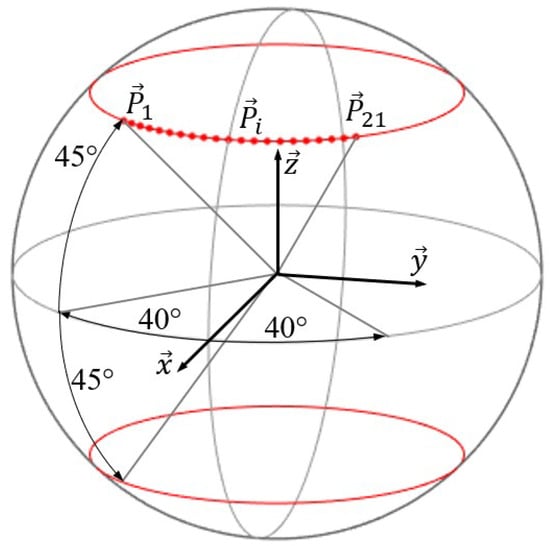 The objective of the kinematic synthesis is to determine the dimensions of a spherical mechanism that directs a point on the coupler along a desired path. The desired path is specified by a set of path points that are placed on a sphere, along an sweep on a constant line of latitude at above the equator. These path points are shown as , i = 1, …, 21, in Figure 1. The choice of for the path points was derived from envisioning the prosthetic as a tube-like object to be placed around the forearm. With the fixed axes of the spherical mechanism located at , the ends of the device can be observed on circles of the same size. Although any positive and negative angle of latitude provides such properties, the desire for the mechanism to be located on and move between the end circles requires the circles to be away from the equator. Other angles of positive/negative latitude could be explored, but as the current goal was to validate the design concept, optimization was left for future work. The choice of the sweep was derived from the goal sweep of to encompass the range of prono-supination in most ADLs. Desirable sweep details are profiled in Section 4.4. With the design concept involving “stacked” components, as seen in the figure in Section 4.5, successfully achieving was identified as the optimization goal.