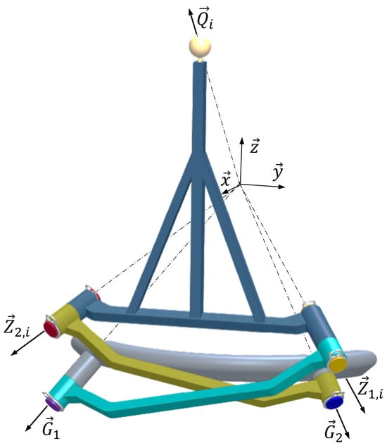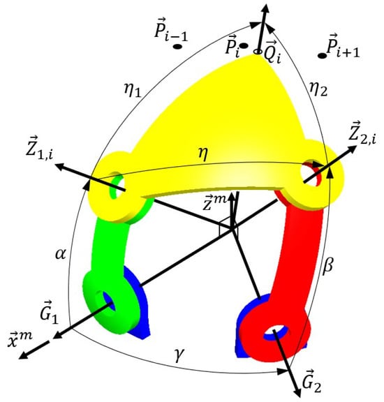 The fixed revolute joint axes of the spherical mechanism are designated and , as shown in Figure 2. The moving revolute joint axes, corresponding with the ith position of the mechanism and specified in the fixed frame, are and .