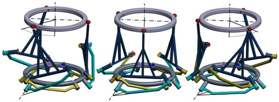 One additional observation about connecting the coupler points is warranted. Although the distance from a common circle center varies, if all three mechanisms move together, the angle from the circle center to any two of the coupler points stays constant at . As such, the top ring is designed to constrain the axes of the three P joints to be separated by an angle of .
